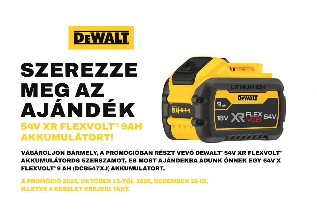 | Rövid leírás a termékről | Azok a vásárlók, akik 2025.10.15. és 2025.12.15. közötti időszakban a promócióban résztvevő DEWALT® FLEXVOLT® termékek egyikét megvásárolják, egy DEWALT® 54V XR FLEXVOLT® 9Ah akkumulátort kapnak ajándékba. Az ajándék átvételéhez a kampányban résztvevőknek 2025.12.21-ig regisztrálniuk kell a vásárlásukat, a termék szériaszámát és a számla sorszámát, valamint a kereskedő megnevezését tartalmazóan. Ennek során az érvényes számla feltöltése kötelező a https://www.dewalt.eu/hu/battery-redemption/ weboldalon. A számlának tartalmaznia kell a résztvevő nevét, és magyarországi lakóhelyét. A kampány csak a kiválasztott termékekre vonatkozik. A kampánnyal kapcsolatos kérdéseket a dewaltpromo@dekoranddesign.hu e-mail-címen lehet feltenni.